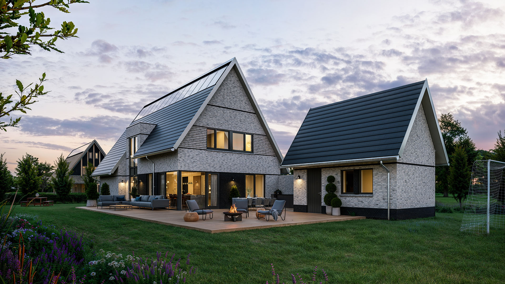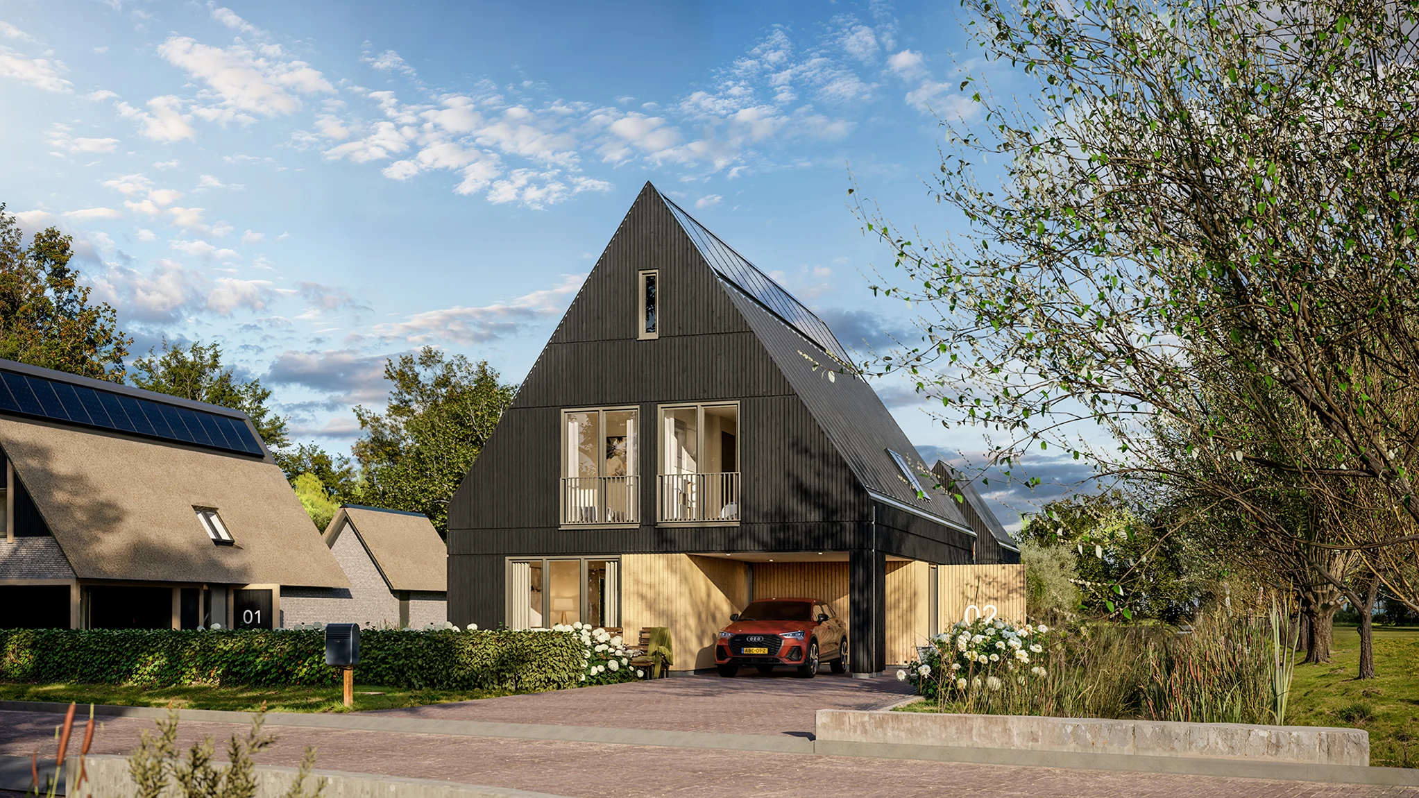 Trouw aan die landelijke sfeer is gekozen voor ‘schuurachtige’ volumes met veel ruimte en lucht, vertelt Edwin: “Het zijn riante woningen met één laag en een steile kap, waarbij we de massa dus relatief laag houden. Het basisidee is dat we de villa’s aan de noordzijde relatief gesloten houden, met een lange, aaneengesloten wand. Hierdoor is de privacy op het terras gewaarborgd en hoeven er dus geen schuttingen geplaatst te worden tussen de kavels. Aan de andere zijde werken we juist veel met glas en openingen, waardoor bewoners een vrij zicht op hun tuin en het achterland behouden.”